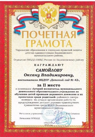 Оксана Владимировна заняла 2 место в районном конкурсе на лучшую организацию работы по предупреждению детского дорожно-транспортного травматизма среди МБДОУ Балахнинского муниципального района в номинации "Лучший воспитатель МБДОУ по обучению детей правилам дорожного движения и их пропаганде среди родителей"